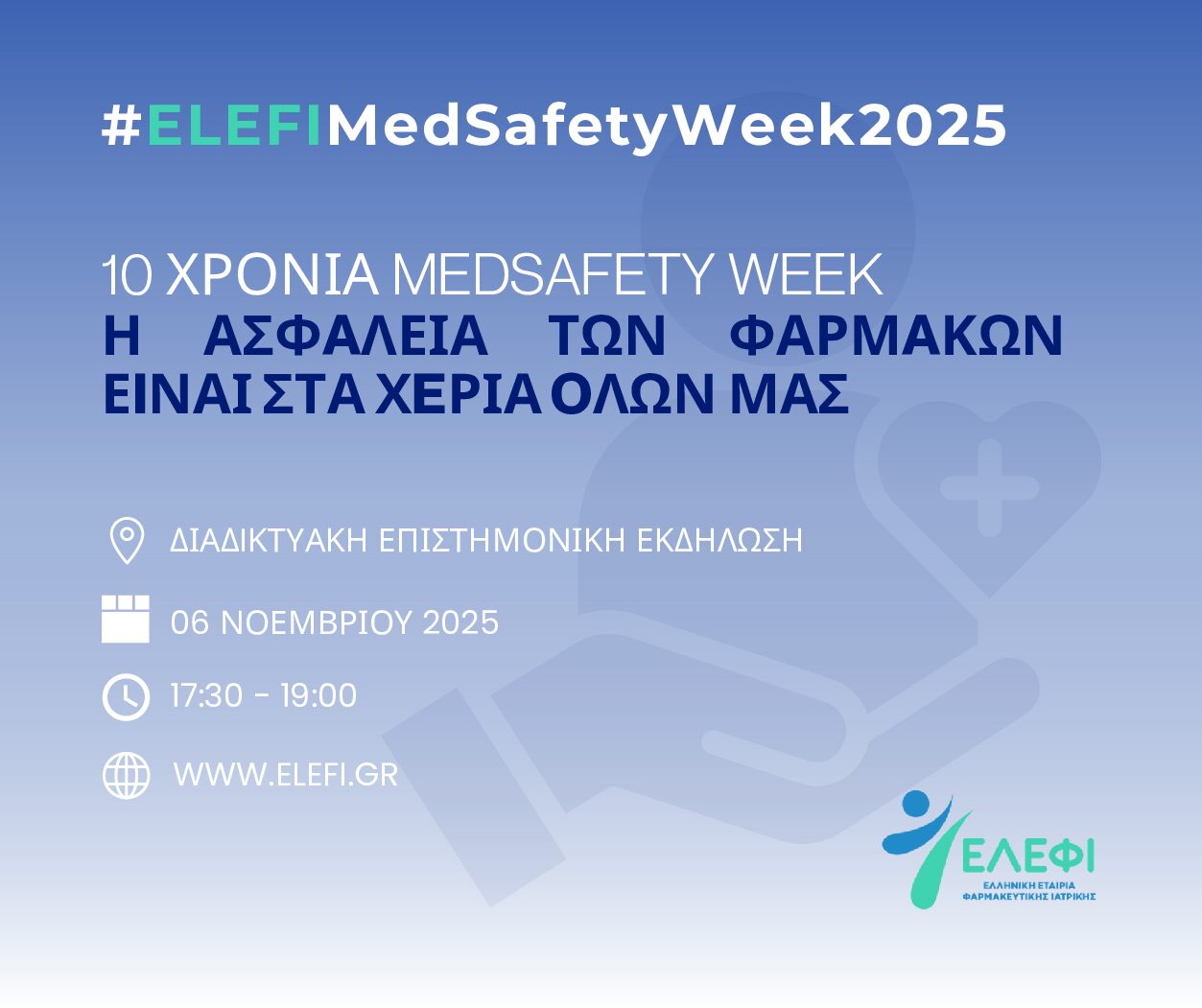 To celebrate the 10th anniversary of the international MedSafety Week campaign, ELEFI is organizing an online event dedicated to medicine safety and the importance of reporting adverse drug reactions by healthcare professionals and patients. The webinar will share best practices, modern reporting tools, and insights to strengthen the culture of pharmacovigilance in Greece.
